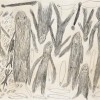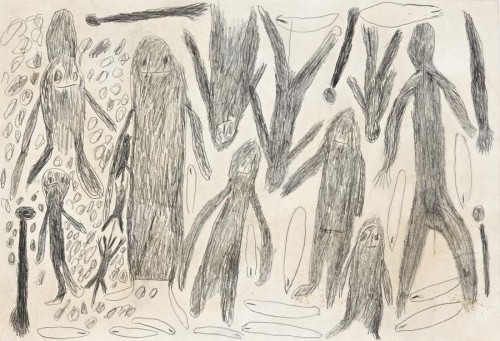 In the drawing, one can see the people and three *mamu* bush cats. The elongated shapes are the trees in which the people tried to hide. The eliptical shapes are discarded spear-throwers; the spears, long-since spent in a futile defense against the ravages of an invisible enemy. Drawn at Papunya Settlement, N.T. (November, 1979)