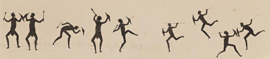 Tommy McRae's drawings are of great significance as they offer rare insights into the Indigenous culture of the late 1800s and are a record of a local response to the increasing pace of change. McRae was a keen observer of the conduct of new settlers that surrounded him, and a man of deep reflection on the disappearance of his own people and culture. Working mainly in Northern Victoria on the Murray River in the vicinity of Lake Moodemere where he worked as a stockman, and in his later life, as an artist where he was, perhaps surprisingly, widely admired and supported by the local community. McRae's visual record was a rarity at a time of great change for the local Aboriginal population as the European settlers were progressively colonising the land and resources. McRae depicts traditional scenes of hunting, fishing and ceremony but many works also include depictions of Europeans, Chinese miners and the figure of William Buckley. Some of McRae's most animated and celebrated works are depictions of fights and warfare, an activity which was carried out according to a particular set of understandings.