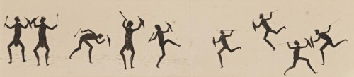 Duellers follows a similar formal compositional arrangement to the artist's depictions of ceremonies. The delicate, decorative and frieze-like pattern of figures engaged in the battle move across the page as silhouettes. Spears, shields and clubs are raised above the men's heads and two pairs of figures engaged in conflict are shown at the extreme left and right. The silhouetted images of the fighters are typical of McRae's economy with the pen yet the gesture and movement in his drawings express all that is necessary to convey the story. As Sayers observes, McRae's 'keen sense of observation and a characteristic storytelling quality, often showing a wry amusement, combine in his drawings to produce an evocative art, full of vitality'.2