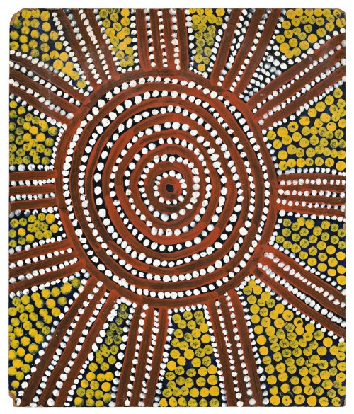 This work is accompanied by a cataloguing card that states: 'This painting represents a site to the south of Lake McDonald called Mamupuyutjanunya. There is a rockhole at this place represented by the large concentric circles, which is related to the production of milk in mothers' mammary glands.'