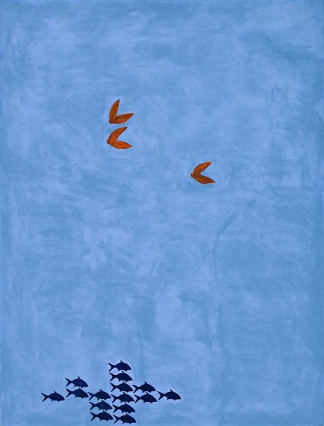 ‘Much of Fiona Foley's earlier work dealt with the elements, earth, water, air. Fraser Island, Badtjala territory, the sea and sky; indicated in the horizon lines which are ever present in her sparse, richly void landscapes and other work. In Black Fish,2000; the fish simply travel the water plane.