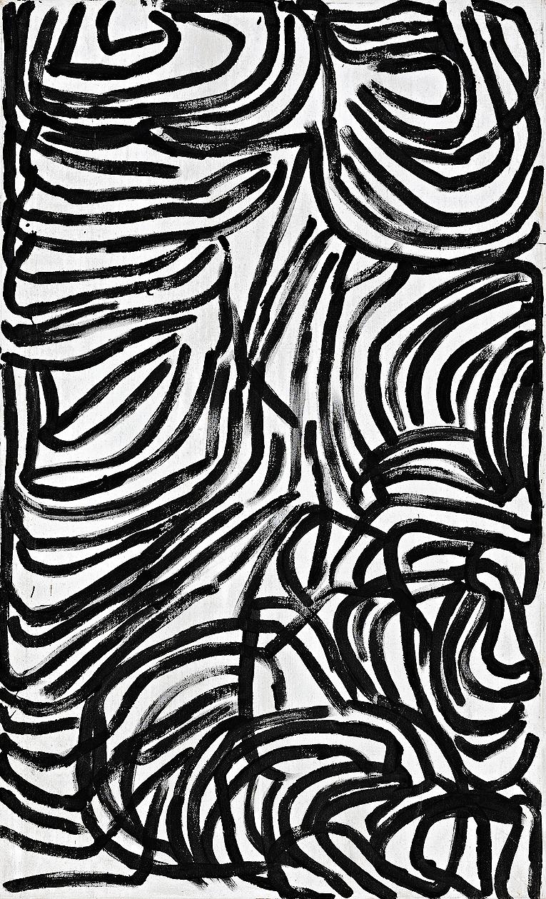 A constant force, ritual and experience within Emily's creative drive, was 'awelye' - ceremonial body painting lines - the ceremonial expression invoking the spiritual power that maintains Nature's fertility and hardiness. The process of awelye is fundamental to the participatory role of women in ceremony. This practice directly resonates with the striking work, Ceremony.