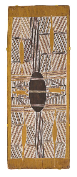 The descriptive label on the reverse reads:'This is one of the dances performed in a sacred ceremony The Djungguan. TheWawilak (sic) Sisters wandered throughout Arnhem Land naming plants, animals and fish, reptiles and places, killing many animals and fish. When they arrived at well of Mirrirmina (rock pythons back) they made a fire and threw the food on to it but immediately everything came to life and ran into the sacred well and thus becoming totemic emblems. Yurlungurr the giant python came out of the well and swallowed the Wawilak Sisters. In a desperate attempt to avoid themselves from being swallowed the sisters had sung and danced all the taboo songs and dances they could think of starting with the crab dance as the crab had been the first to jump from the fire and run sideways down to the well. Yurlungurrtook the sisters back through the [subterranean] waters beneath the well to their own country and regurgitated them onto dry land. They appeared in a dream to two Wongar men and told them that all the people must dance the same dances and sing the same songs as they had before being swallowed and these were to be performed at the time of the circumcision rites. Each sister had had a baby with her at the well and had intended to circumcise them but now they passed on instructions to the men to do this for them. Here two men representing the Wongar mythological figures dance with woomeras and spears around a sacred well. Goannas shown represent one of the totems of the artist handed down to him by his father.'