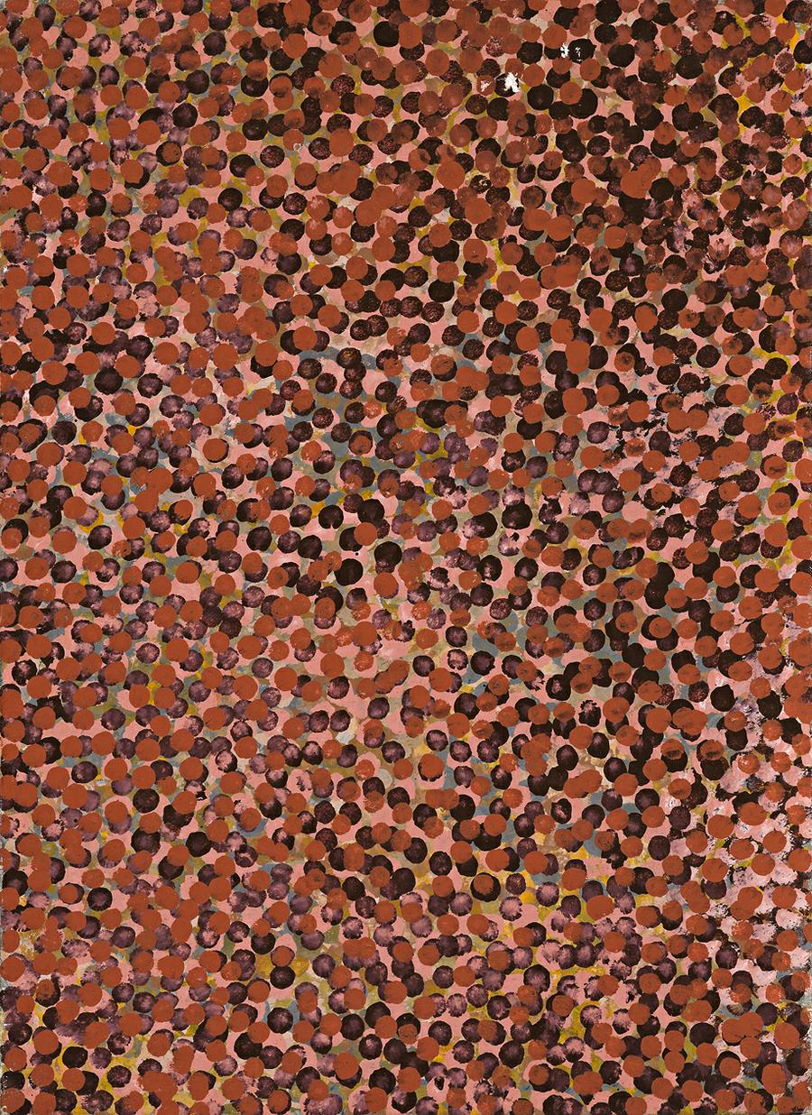 This is a small but powerful image - it speaks of survival in an unforgiving arid landscape. Emily Kngwarreye canvases often drew on memories of bush tucker gathering in the tough days of her childhood after talking about 'olden times' and 'hard work'.