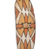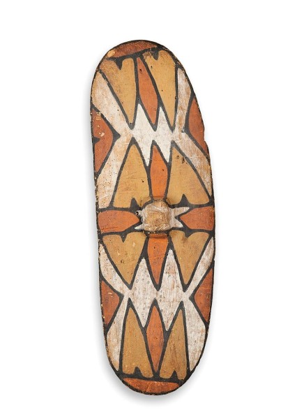 The designs on shields such as this are associated with clan totems and are thought to possess protective qualities when used in battle with large single-handed sword clubs. The shields also played an important role in the initiation ceremonies of young men. This particular example shows evidence of extensive cultural use. Shields of this type were used to deflect spears, clubs and boomerangs during large gatherings of Aboriginal people, where disputes between individuals and groups were settled.1 It is also noted that the designs applied to the front surface of such shields differed, suggesting that they constituted an individual's 'coat of arms'.