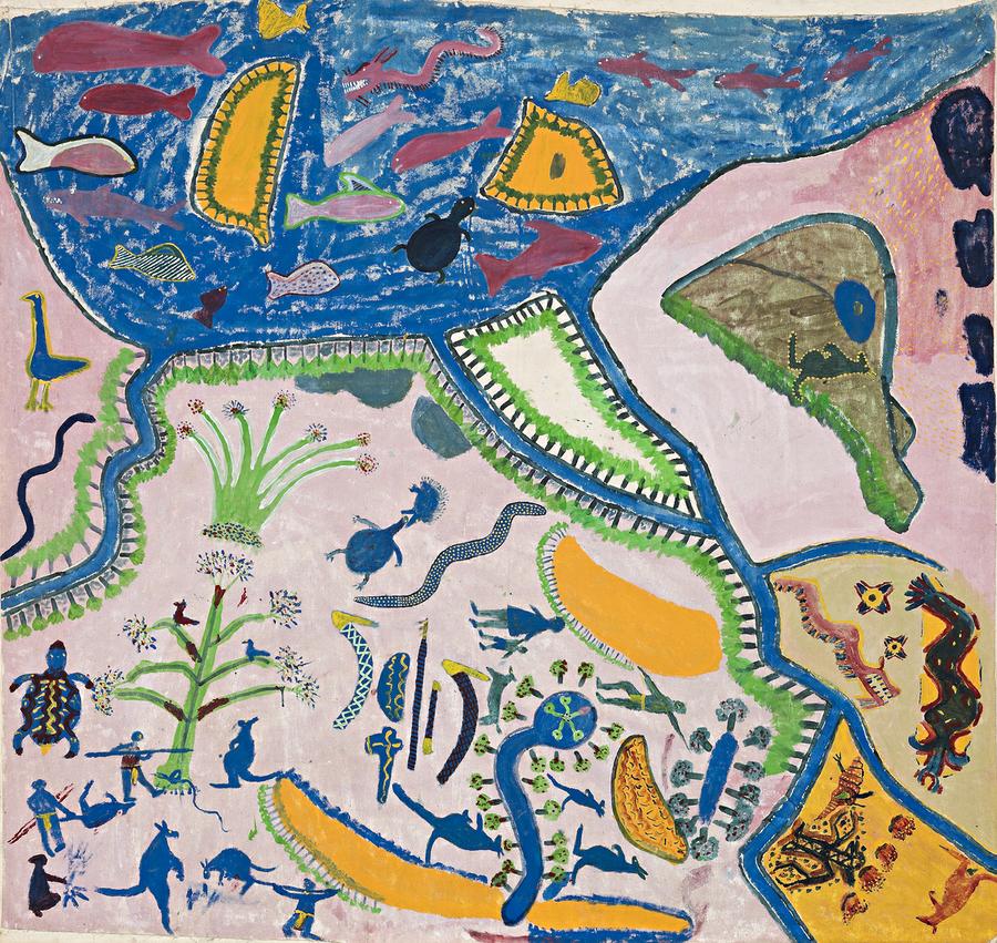 This painting, Limmen Bight Country 1987, a large painting executed by Munduwalawala in the first year of his art production, is centred on this expansive country, incorporating elements of the landscape, abundant animal and marine life, scenes of hunting and camp life together with images of the ancient mythological creation stories. As noted by MattKing 'Always an individual, Riley produced pictures of country in lateral perspective as well as conjunctions of animals and marine creatures flung together at odd angles sometimes on hot pink grounds.'3