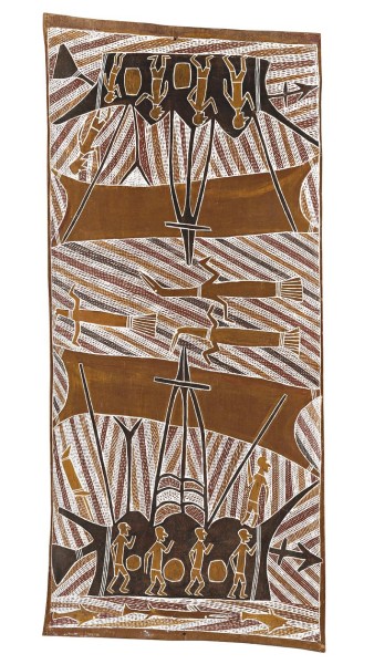 A common theme in Arnhem Land bark painting, this work recalls the Macassan fisherman who every Wet Season would take advantage of the south East trade winds and travel to the shores of Arnhem Land to collect fish, pearl shell and sea cucumber (trepang).