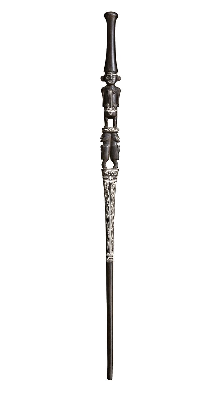 carved hardwood incorporating three figures above with finely incised lime-filled traditional designs