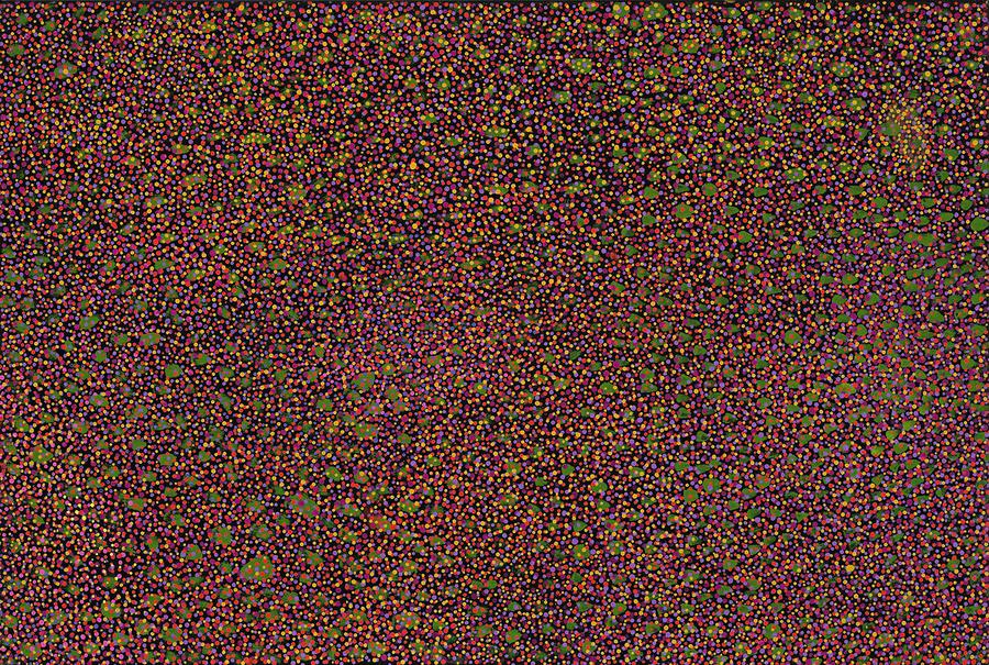 This work is accompanied by a certificate of authenticity from Warlayirti Artists which states in part: 'This painting depicts Lake Gregory which has Mungul, a type of low lying creeper, surrounding the perimeter of the lake. The purple, brown, red and green colours depict the various stages of the plant growing. The purple and pink show the plant more advanced stages of growth but still not ready for collection while the yellow colour represents the plant ready to be collected. The seeds of the plant are collected and washed then left in the sun to dry. They are then ground and made into bush damper.'
