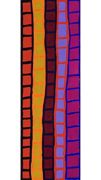 This work is accompanied by a certificate of authenticity from Warlayirti Artists which states in part: 'The country here is known as Narroo. This painting depicts part of the Tingari Cycle and tells the story of two Tingari men of the Tjapangati and Tjapaltjarri skin groups. The two men were painted up and had covered themselves with flowers so people wouldn't see them, they then lit the country for the first time during the Dreamtime. The resulting fire caused many people to be trapped and eventually were burnt. The lines represent high rocks where the people hid to try to avoid the fire and the squares depict the firelines caused by the fire.'