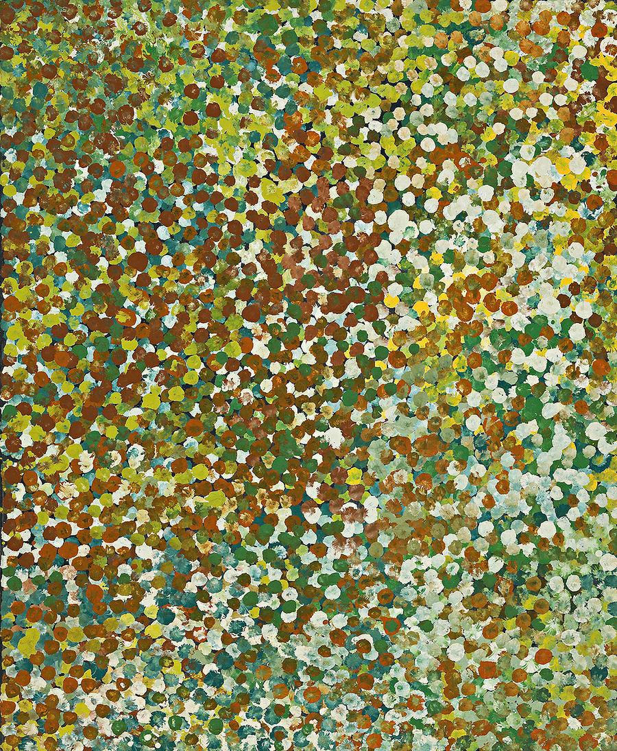 Significantly in this early work, Summer Flowers, Emily utilises a broader brush with which to make her mark. Emily was gradually covering over, or dispensing with completely, the linear base of the Atnulare Yam, tracks and symbols. This period is characterised by an intensity of colour, aided by a recent expansion of Emily's colour palette and a direct, clear application of paint. Summer Flowers is a harmonious all-over composition, in which a fecund environment, with verdant shades of green, signifying plants at different stages of growth in the warmth after rain, is intermingled with the richness of the soil and a scattering of flowers and plant matter.