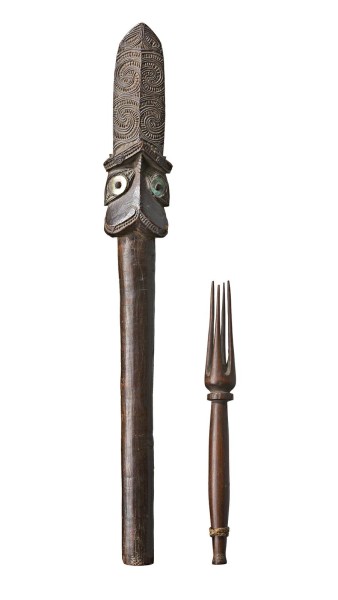 the Taiaha of carved hardwood with intricately incised designs in laid with mother of pearl; the fork of carved and polished hardwood with four prongs with plaited fibre band at the handle