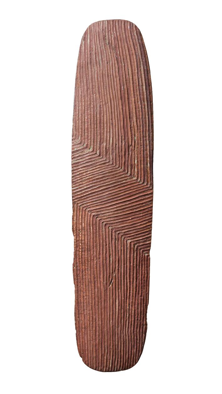 carved and incised hardwood with broad zig-zag design and natural earth pigments