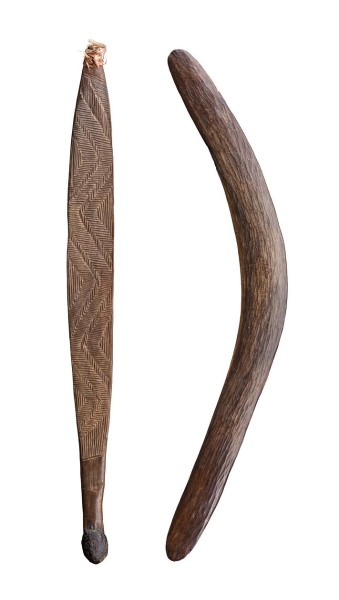 carved and shaped wood, the handle of the spearthrower encrusted with spinifex resin, the wooden peg at the top attached with natural fibres and the front decorated with intricate zig-zag designs; the convex face of the boomerang replete with fine adze markings