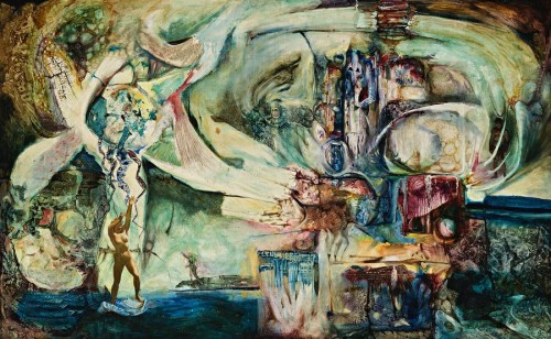 Tales from ancient Greek and Roman mythology excite the imagination even today, explaining the noble, venial and other lesser ways of the gods and goddesses to us mere mortals. They are, of course, projections of humanity in all its beauty, passion and ugliness. For the Surrealist, these myths provided unrivalled sources for their explorations of the id, those inherited impulses of instinct from the unconscious. Long Australia's leading Surrealist, James Gleeson found them a fertile source throughout his career, the occasions and settings for epic journeys into the subconscious. Paintings in his 1956 exhibition at the Macquarie Galleries, Sydney, included subjects inspired by Prometheus, Odysseus, and Achilles as well as the two paintings on offer.