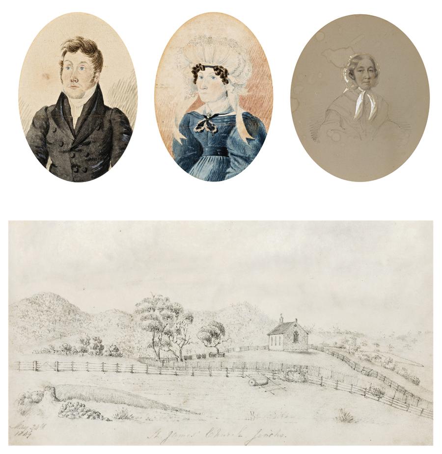 Charles Henry Theodore Costantini was transported twice to Australia, first to New South Wales in 1823 and later to Van Diemen's Land in 1827. Described in records as 'disposed to be very troublesome' and 'highly insubordinate', he was eventually freed on 14 March, 1834.1 During his incarceration at Port Arthur he had been assigned to the Colonial Assistant Surgeon Dr Thomas Brownell, thus upon pardon he was employed as a medical assistant by Dr John Maule Hudspeth at 'Bowsden', Jericho, who with his wife Mary, née Lowrey, are the subject of this charming miniature portrait pair. Dr Hudspeth and his wife emigrated to Van Diemen's Land in the Minerva in 1822, leaving behind in Northumberland their daughter, Elizabeth Hudspeth (1820- 1858). She was eventually sent to Hobart to be re-united with her family, however, on the voyage she slipped and injured her knee and upon arrival her father would be compelled to amputate her leg, without anaesthetic. Having survived this horrific ordeal, she became an accomplished amateur artist and drew this charming topographical sketch of her family home, 'Bowsden' at Jericho, north of Hobart. The Thomas Bock portrait sketch probably depicts a family member and was also passed down in this group through generations of Hudspeths. Elizabeth Hudspeth's brother, Frank, later became Canon of St David's Cathedral, Hobart. When she contracted tuberculosis in the late 1850s, Frank took her to Madeira in the Canary Islands in the hope that she would recover. However, sadly she died there on 29 May 1858.2