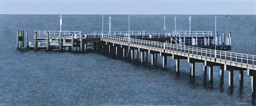 William Delafield Cook transforms the ordinary and everyday object into the intriguing and significant so that we see its existence from a new and illuminating perspective. Under his influence a simple rockpile or haystack becomes a metaphysical experience of light and dark that evokes archetypal structures from earlier civilisations. In the early 1970s he painted a series of cosseted gardens alongside wilderness landscapes for a solo exhibition at Redfern Gallery, London and this juxtaposition shed a new light on the correlation between nature and artifice, and man's need for the contradictory states of wildness and order. It is this tension that has consistently underpinned his painting and remains evident to this day. Another remarkable element in Cook's painting is 'stillness'. Following his 1973 Redfern exhibition, the artist wrote to his father William Delafield Cook senior commenting, 'About my paintings, the quality of serenity you mentioned is very important to me - some critic mentioned stillness, as if the world had been frozen for an instant, which is very much the quality I have tried to achieve.'1 Cook settled in London in 1958 when a short trip to the great metropolis turned into a permanent arrangement. It proved to be an ideal base for an artist whose practice is very much that of the painter traveller and most of his work emanates from the overseas journeys he takes, often with his wife and three children. Pier 2006 emerged from an expansive road trip the artist took with his artist son Jonathan Delafield Cook from Sydney to Melbourne. The journey took the pair from Yass, through Gundagai, Euroa, the Murray River, Mallee country and Phillip Island and produced a remarkable body of work culminating in a joint exhibition at Rex Irwin Gallery in September 2006. The painting depicts the pier at Cowes, Phillip Island, which is a popular fishing spot and is usually populated with families and amateur anglers all year round due to its protected aspect. Characteristic of his oeuvre, Cook has chosen to show the structure empty and silent, untouched by human contact and thus at its most poignant.