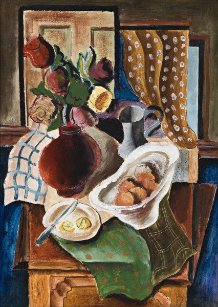As a young artist of tremendous talent, Russell Drysdale showed a lively interest in the modern movements in art. This was fed both by Melbourne's George Bell School and his several visits to Europe during the thirties where he gained first-hand experience of the work of the artists of the School of Paris. Reminiscing to Geoffrey Dutton years later, Drysdale said, 'Modern paintings which seemed to me quiet when I had seen them as reproductions shown to me by Bell, came as a sort of shock when I saw these things in galleries; quite suddenly they had a meaning which they never had in books.'1 When Drysdale showed two of his works with the Group Twelve Exhibition in 1937, George Bell's supportive review described his work as having 'great vitality'.2 Less than twelve months later, when Drysdale held his first solo show, Basil Burdett, the noted art critic for the Melbourne Herald, stated, 'I have seldom seen a more promising exhibition by a young painter anywhere.'3 Still Life,1937, the painting on offer, was among the works exhibited. Burdett acknowledged that Drysdale's 'eclecticism argues the obvious fact that Mr Drysdale has not yet found his own style ... [but shows] a healthy and wide range of interest in contemporary artistic thought and expression ...'4