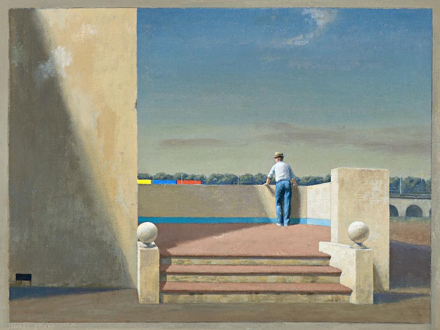 The difference between the two paintings lies in the off-centre, in the figures - a bikini clad women seated on a red and white striped towel occupies the larger painting, replacing the standing man in the study. Sunglasses and a loose bikini top, she stares directly (enticingly is aword not found in Smart's iconography) at the viewer. The man is seen from the back, blue jeans harmonising with other objects of the same hue. The figure placements are exact, as props, as Smart is wont to say, to give scale for the rest of the picture. Neither they nor the artist utter a word. It is, of course, Smart at his enigmatic best. As Barry Pearce says in the 1995 exhibition catalogue, 'Jeffrey Smart is one of the most intriguing of Australian painters. He presents a world pervaded by visual ironies, but devoid of emotional engagement.'1