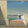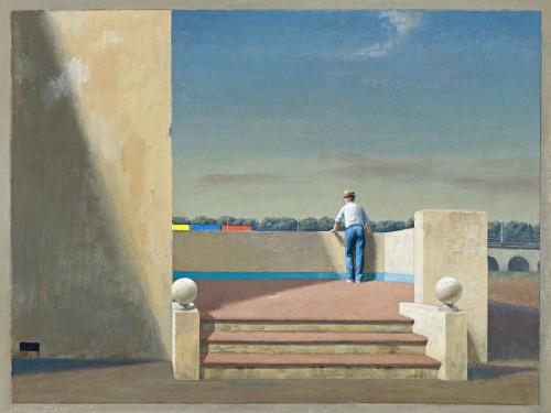 Jeffrey Smart's exhibition at the Australian Galleries, Sydney in 1995 included a number of major works and their related studies. Among the portraits were fellow artist Margaret Olley as seen in the Louvre Museum together with two oil and pencil studies. There were five studies of Clive James. The subject paintings likewise included a number of studies, invariably important keys to the understanding and evolution of the 'finished' painting. I say 'finished' for so often the studies in oil are complete paintings in their own right. Study for The Terrace, variations on a theme is an example, chosen for illustration in the exhibition catalogue over the slightly larger painting, The Terrace, variations on a theme. The settings are the same. Shadows take on forms and colour contrasts create plenty of visual interest. They present Smart's evergreen involvement with isolation, the alienation and beauty of the modern urban world, and his consummate sense of composition.