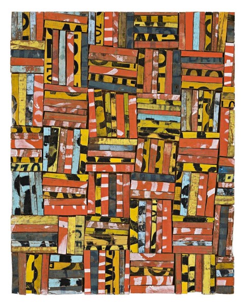 Tesserae, a latin word, refers to the small pieces of glass or ceramic used in mosaic and in antiquity it could also mean small squares of bone or wood used as a token or a tally. The word tessellation in architectural contexts refers to the arrangement of tiles into a repeating geometric pattern. As a concept it is at the heart of all that Rosalie Gascoigne created as the great collector and re-organiser of the world's discarded and unwanted surplus. All of her work is a type of organic tessellation and in some of her most loved installations she used the great hoard of soft drink crates she found at the Schweppes depot in Queanbeyan in the early 1980s. This culminated in a watershed solo exhibition at Roslyn Oxley9 Gallery in 1989, which included the monumental work, Monaro (Art Gallery of Western Australia) and All That Jazz (Private collection). In this series she took humble soft drink crates, cleaned them, broke them into thousands of pieces and in reassembling them in her own inimitable way she transformed the precious tesserae into landscapes of the imagination, musical evocations, flowers and deep ideas. Tesserae 2 is part of a group of four works included in that same critical exhibition, which explore the idea of recurring patterns under the influence of Gascoigne's rare sensibilities. The use of panels from red and blue boxes alongside the tell tale yellow Schweppes crates in this work hark back to an earlier more minimalist work, Parrot Country,1983 (Gascoigne Estate) which was greatly admired by James Gleeson. The arrangement of these colours took on a special significance for Gascoigne and in 1989 she gave a larger version of Tessarae 2 as a wedding gift to her son Martin. She called it Wedding Feast (Australian National Gallery) and it is these slightly weathered but jewel-like primary colours which gives it an energy and exuberance so deeply characteristic of Gascoigne's metier.