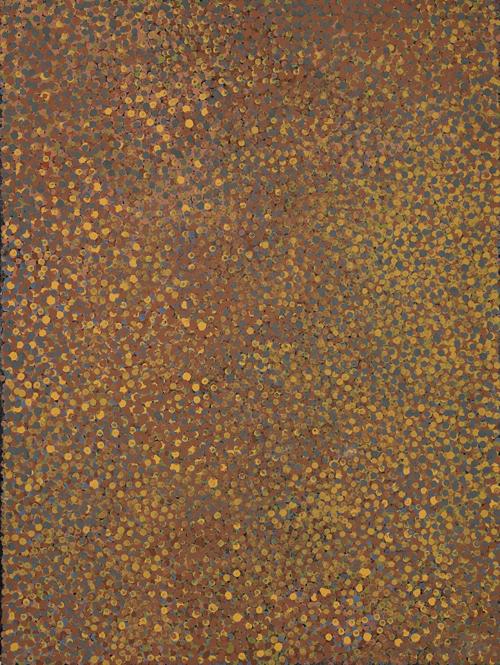 The year 1990 had one of those rare seasons, hence it is not surprising that Emily Kngwarreye has gone with the mood of her country and produced this work. Her inspiration in this instance comes from a small wild tomato bush called 'katjera' that produces a fruit that can only be eaten when yellow, not green.