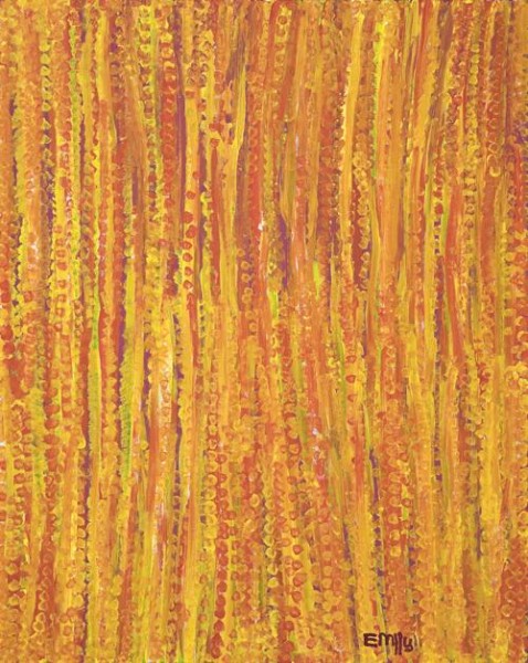 On this canvas, the artist's choice of a rich yellow represents the most important plant in her custodianship, namely the 'Anooralya', a hardy and fertile plant that provides both a tuber vegetable and a seed-bearing flower called 'kame' - Emily's tribal name. Other colours reflect the time of the season when particular bush flowers flourish. These flowers contain seeds that are collected to make types of seed cake, damper, medicines and love potions. Other colours symbolise the 'ndorkwa' or bush plum, when unripe. The dots being placed in lineal fashion and placed among lines connects with the practice of anointing the body with lineal designs during ceremony - thus adding another dimension of celebration in the execution of his painting.