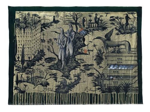 Victorian ornithologist and lawyer Sir Walter Lawry Buller (1838-1906), responsible for the killing and unprincipled trading of thousands of rare New Zealand native birds, is the ominous and shadowy inspiration for Hammond's Buller series. By exposing Buller's dubious ornithological activities, Hammond holds a mirror up to our post-colonial society. In these contemporary history paintings which feature his signature bird creatures, we are reminded of prismatic misdeeds of the past, and indeed of the recent debates regarding the discovery and ownership of New Zealand. While researching the islands, Hammond came across a copy of Buller's lavishly illustrated A History of the Birds of New Zealand (first published in 1873), which led him to discover more about the darker side of the author's ornithological work. Buller, a firm believer in the Darwinian theory of natural selection, regarded the demise of New Zealand's flora, fauna and indigenous as foreordained, so why not gather and sell these specimens while he could? He (along with many other 'bird stuffers') largely supplied English aristocrat Lord Rothschild, an avid collector of these valuable 'scientific' bird skins, who had concluded that such rarities might carry clues to the riddle of that Victorian obsession, evolution. Buller's voracious taste for collecting and trading rare birds helped drive some to extinction, notably the huia. The rarer the birds became the more lucrative the trading; the thrill of discovery and having the lovely feathered creatures in glass cases thwarted any sense of moral duty toward their preservation...