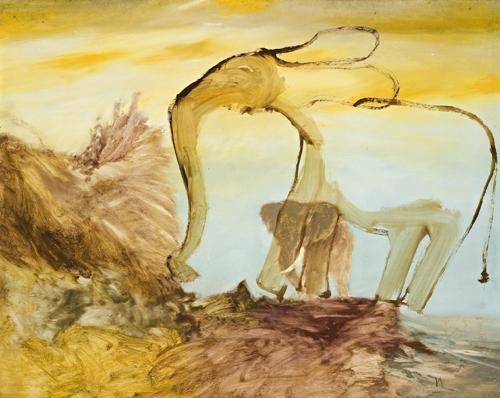 When first exhibited at Marlborough Fine Art, London in June 1963, the animal paintings inspired by Nolan's recent African journey attracted enormous acclaim, with buyers including celebrities such as the Queen and Hollywood star Rod Stieger. Seeking to bestow a tentative permanence to the elusive transience of the African landscape, Nolan here radically abandoned the polyvinyl acetate medium he had employed since the Gallipoli, Leda and Mrs Fraser paintings of the late fifties and early sixties, in preference for translucent washes of oil paint, with details rendered in a more heavily loaded brush. Thus, in works such as the present Elephant and Calf, c.1963, it is the technique itself as much as the image which evokes the febrile sense of animals in motion and the endless, evanescent plains so characteristic of his African experience; as the artist mused, 'a fuzz of colour, a dyed streaky ground, texture achieved through the pigment, finally a deft stroke... to mark out the essential characteristic hieroglyph.'2 As observed by a reviewer at the time of the London exhibition, 'Seldom perhaps has the fugitive nature of the wild creature been so excellently conveyed, nor so much essential feeling extracted from the confrontation between man and beast.'3