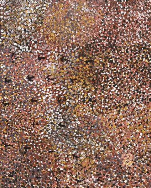 On this significant canvas, we see a rare exposure of the mythological emu as it grazes across the country in a good season. The white dots show that the flower for the Finger Yam is there for the Emu's picking as well. Through the 'awelye' (ceremony) that pertains to custodians of these bush foods, Emily ensures their continuous growth into the future.
