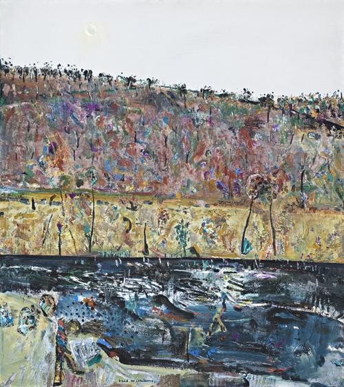 Fred Williams painted Indigo Pool on the Lederderg River not far from Bacchus Marsh, some fifty-four kilometres west of Melbourne. The date was probably 11 May 1977. Williams had only recently returned from his prestigious and highly successful exhibition at New York's Museum of Modern Art. Painted on site, it was worked on and finished later in his studio. Although the label on the back of the painting gives the date as '1978', Lyn Williams believes that a more correct dating is 1977-78, basing this on Fred's diary entry for this work.1 Williams had been painting in the Bacchus Marsh area for some time, frequenting the nearby Werribee National Park which inspired his Werribee Gorge series of 1976-77. Together with the slightly earlier Kew Billabong series, they witnessed the richest of change, introducing a palette with the colours of the rainbow to enthral the viewer. Indigo Pool is a felicitous example, the eye being drawn as much by the depths of the indigo as the surface sparkle of whites. In the colour spectrum, indigo falls between deep blue and violet. Williams uses the colour motif like a musical theme, moving blues into mauves and purples, and weaving them through the composition in moments resonant and subtle. This use of a dark indigo occurs in other paintings of the time, reaching a brilliant crescendo in the Waterfall Polyptych, 1979, in the collection of the Art Gallery of New South Wales. As in music, the different horizontal sections of Indigo Pool provide the separate movements of the composition; while the surface dances with the brilliance of the technique, smooth passages contrasted with textured highlights. As in so much of his work, one senses that this image is but part of the ongoing creation, the endless flow of the landscape on either side limited only by the edges of the canvas. Williams captured the peculiarity of the Australian landscape, transforming its seeming monotony through his brilliant and expressive talent. Colour is used as form, with vivid touches of red and oranges against cooler hues and defining blacks. One is attracted as much by the textural beauty of its surfaces as the inventive imagery, of the lively movement of the flowing waters of the pool, or the calm seduction of the sky, an old moon sitting in the arm of the new. The evident quality of the painting aside, Williams thought so highly of it that he included it in his prestigious exhibition shown in Paris and London in 1980.