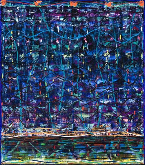 signed, dated and inscribed with title on stretcher verso:“LICORICE NIGHT” Michael Johnson 1998