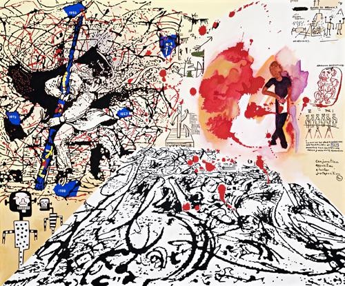 Notes to Basquiat: Myth of the Western Man, 2001, belongs to the group of paintings within this series which juxtapose Basquiat's rap style with the characteristic interlaced lines of Jackson Pollock, a mythic figure in modernism and thus, according to Bennett, an important player in the conspiracies of colonial cultures. Depicted in every composition as the black and pink iconic figure, Pollock is not, however, simply a convenient image-maker that suits Bennett's argument. More significantly, he is a way of bringing Basquiat home to Australia - 'for Pollock has a place within Australia's psyche because of the Blue Poles fiasco. Prime Minister Whitlam's purchase of the painting made it emblematic of his Government's radicalism and determination to move on rather than remain in the past... Bennett's return to Pollock is like a calling card reminding the Howard government that the ghost is still out there.'3
