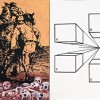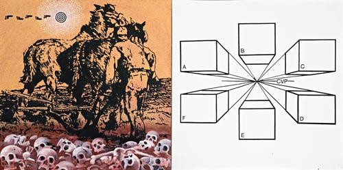 Hence, while The Plough 1989 derives from a drawing by iconic Australian landscape artist Hans Heysen, it has been manipulated here to feature fields of bones which, according to Bennett, are the foundation of Australian wealth. Similarly, The Betrayal (Pieces of Silver) and Web of Attrition (which draw their impetus from nineteenth-century colonial paintings), and Terra Nullius and Prologue: They Sailed Slowly Nearer (both based on social history book illustrations) suggest the betrayal, humiliation and killing of Aboriginal people as a result of colonial settlement. In each of these works, the use of dots is equally imbued with dual meaning - referring on the one hand to the unifying dot matrix of photographic reproduction in the textbook images appropriated, and on the other, to the technique so characteristic of Aboriginal Western Desert painting. In his endeavour to create fields of disturbance which not only encourage but necessitate the viewer re-reading the image (and the mythology), Bennett moreover undermines the prevailing 'colonialist' mode of representation by foregrounding perspective, and thus exposing the ideological framework that exists between the observing subject and the observed object. The diagram on the right with converging lines towards a central vanishing point further articulates this concern with the power inherent in the Eurocentric technique of creating an illusion of depth. As Bennett elucidates, '...By disrupting this field of representation, I hoped to implicate the observing subject in the production of meaning, not in order to affirm the subject but in order to stimulate thought and the possibility of exceeding the historical parameters that frame it.'3