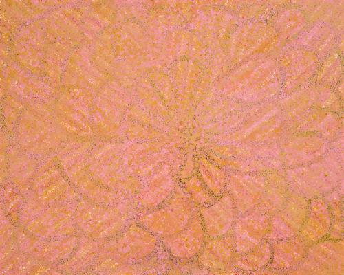 Emily's reaction to the desert's fertile energy that launches such amazing growth after rain, has inspired a fabulous use of the yellows, deep pink, and gatherings of murky-coloured dots. Heat ripens the fruits, and brings the flowers and grass seadheads to full maturity. Gradually the bloom wanes, everything dries off, and the seeds disperse. In ceremony, these life cycles are celebrated and spiritually nurtured. In everyday life, Emily also nurtures the social lives of her family, hopefully ensuring that they too will survive the erratic nature of the desert's seasons.