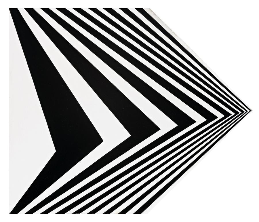 Insistently abstract with its stark monochrome palette and arresting formal arrangement, Off, 1963 is a compelling example of the controversial Op Art compositions which first brought Riley international recognition during the 1960s. Seemingly bereft of any trace of the external world, such works featured geometric shapes - squares, ovals, circles and triangles - structured in increasingly subtle and disorienting ways. Not surprisingly perhaps, critics at the time frequently interpreted these works as purely formal exercises or worse, dismissed them as decorative 'trompe l'oeil' pursuits. Yet while utilising precise structures, Riley does not intend these as ends in themselves; instead the viewer is drawn into a dialogue with the work, thus subverting the prevailing conventional assumption that a painting is an essentially passive, inert object.1 As Riley herself muses, the appearance of a painting such as Off is 'as much inside one as it is 'out there'.'2 Accordingly, it would seem futile to attempt to describe Off for example, in terms of arrows or chevrons for, while the work's nature is in a sense 'contained' in these ostensible surface marks, its meaning only emerges through the viewer's very private and unique responses to the sensations elicited by the painting's physical features. Thus evoking a range of visual experiences - some viewers might focus upon the implication of movement, while others the sense of compression, and still more might perceive light as colour - the composition remains deliberately enigmatic. As the artist asserts, 'I want my paintings to exist on their own terms. That is to say they must stealthily engage and disarm you. There the paintings hang, deceptively simple - telling no tales as it were - resisting, in a well behaved way, all attempts to be questioned, probed or stared at and then, for those with open eyes, serenely disclosing some intimations of the splendours to which pure sight alone has the key.'3