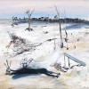 In The Artist's Camp, 1973, the painter becomes the black beast stretched across the foreground, brushes fist-held in seeming anguish and frustration, lovers in the middle ground. The title evokes tradition and invites comparison with the past, possibly Tom Roberts's 1886 painting of the same title in the collection of the National Gallery of Victoria, Melbourne. Gone are the tent and suppertime shared by Frederick McCubbin and Louis Abrahams. Gone is the encompassing bush of Houston's farm at Box Hill. Gone is the companionship between artists and the bush. They are replaced by a crude lean-to and blighted desert. The late twentieth century was, at this particular time, a harsh one for the painter, under challenge from conceptual and other forms of art in which the craft of painting was thought no longer relevant. The metaphor of the barren landscape with its dead and dying trees is meaningful.