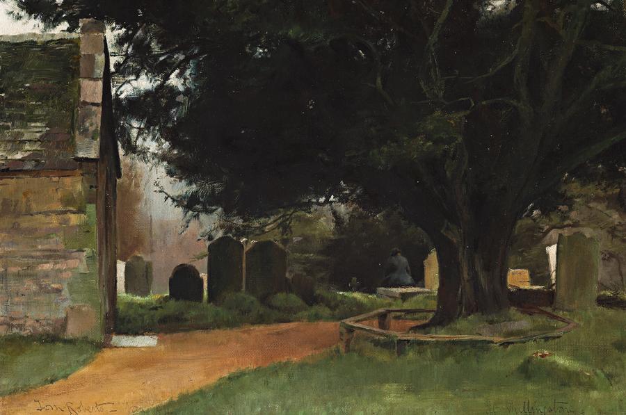 Tom Roberts was born in Dorset, Thomas Hardy country, where his father Richard Roberts was editor of the Dorset County Chronicle. Following Richard's early death in 1868, Tom's widowed mother and family migrated to Australia, leaving Dorchester behind. The county continued to have an appeal for the young artist, who visited there in early 1884 while studying at London's Royal Academy Schools. Its attraction continued into later years, seen in the seasonal paintings of spring and autumn in Dorset of c1910-14, and A Windy Day, Dorset of the early twenties. Churchyard at Shillingstone is a rare work from his first visit, the choice of subject being a resting place for many memories.