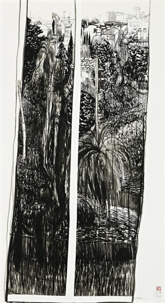 Using the window as a frame, Brett Whiteley invites the viewer to gaze out onto the lush gardens and the wilting trees that are being drenched by the rain. Buildings line the horizon while a glimpse of the Sydney Harbour Bridge is offered in the top right corner. July 2 1975 Rainy Day - All Day, 1975 is a particularly important picture for the artist, being a large and ambitious work on paper that made reference to Whiteley's life in Sydney. Whiteley returned to Australia in 1969 after nine years abroad and, after initially renting the top floor of the Lavender Bay property, in 1974 he and his wife Wendy purchased the house with panoramic views of Sydney Harbour, finding inspiration through 'the stunning harbour views in all their variation of mood and tone through the windows...'1 Whiteley went on to paint this scene a year later, replacing the rain with a sunlit glow in striking hues of gold and blue, titled Park under sunlight, 1976 (National Gallery of Victoria, Melbourne), once more utilising the window as a divide between the viewer and the exterior.