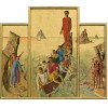 When O'Brien was awarded the inaugural Blake Prize for Religious Art in Sydney in 1951, he was formally recognized as one of Australia's leading religious painters. The prizewinning painting, The Virgin Enthroned, 1951, was acquired through the Felton Bequest by the National Gallery of Victoria, being greatly admired for its 'Byzantine' riches of colour and form.3 O'Brien had adopted the triptych, as in our painting, that three-panel format traditionally associated with religious art. The Miraculous Draught, c1958 with its gold leaf background shows the then creative influence on O'Brien of the painter, Duccio, whose work he had admired in Siena during earlier travels. 'It was in Siena', O'Brien said, 'where I first really had a proper aesthetic experience, the first time I really felt design and colours.'4 While Duccio and the art of his contemporaries derived from Byzantium, it was a time of restless change in Italy as Renaissance ideas began to break through the bonds of the later Middle Ages. O'Brien seized upon its liveliness and handling of space, engaging gilded surfaces to provide the perfect foil for his expressive feeling for line and sumptuous sense of colour. To The Miraculous Draught he added an idiosyncratic air of fantasy derived from religious mystery. In this and other works, O'Brien thereby brought the potency of the icon, the holy image, into the new world of contemporary art, full of aesthetic delights.
