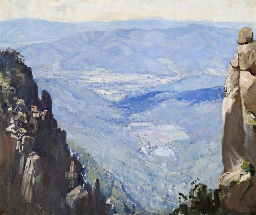 Taken from the same scenic spot as our painting, Blue Depths, is a closely related work, the two views differing only in as much as Streeton had taken a step forwards for the larger work. In Mount Buffalo Streeton encompasses a wider, even more panoramic view, retaining all the drama of the scene. The play of foreground verticals against distant horizontals emphasises the perpendicularity of the drop. The close up view of the rocks increases the precipitous feeling, all abruptly falling away, with the spread of valley and landscape below enveloped in the heat haze of late spring. As Mount Buffalo was exhibited with London's Royal Institute of Oil Painters, it is possible that Streeton referred to it in London, together with a number of sketches, for the painting of Blue Depths. Back in Australia, in March 1920 Blue Depths, together with View from Mt Buffalo and On Mt Buffalo were exhibited in Streeton's solo exhibition at the Victorian Artists' Society Gallery. These three specially chosen paintings were exhibited among many works of the Western Front, painted when he was an Official War Artist during in France 1918. As the above View from Mount Buffalo and our painting are the same size, perhaps they are the one and same work.