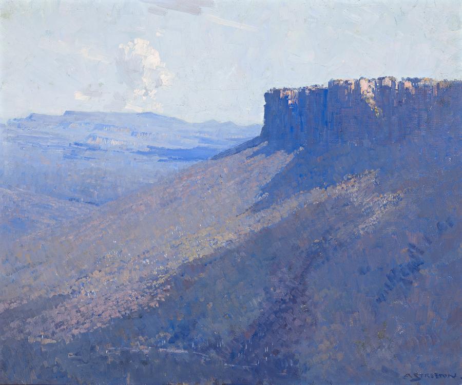 The sentiment of Australia's vast spaces is admirably conveyed in a collection of paintings of the Grampians and Dandenongs by Mr. Arthur Streeton, that will be on view at the Athenaeum Hall, Collins street, to-day'.1 So began The Argusreview of Streeton's exhibition that offered Melburnians and visitors a splendid diversion during the Cup Week of 1920. Mount Rosea was singled out, with others, for special mention as being among those paintings in which the artist was successful in solving the difficulties 'of changing sunlight and shadow ... giving a fine suggestion of the beautiful colour of the Australian mountains'. The Age was even more enthusiastic, its critic describing the exhibition as 'an important event in Australian art'. 'It marks', the writer continued, 'the return to his position of preeminence of our greatest landscape painter.'2 Warming to his subject, the reviewer wrote,'The pictures of the lovely scenery of the Grampians Mountains that are shown in the present exhibition are more poetical and more romantic than anything that Mr Streeton has previously done.' He continued, 'What Streeton has added to his wonderful technique is a warmer note of sentiment.' Then comes the curious observation, 'Here and there that note is over-emphasised, as in the picture of Monta Rosea, where the simplicity of the effect departs from sincerity.' To the modern eye, this is exactly why Mount Rosea has such appeal - the striking yet powerful simplicity with which Streeton has achieved his noble ends. The view, which is considered to be one of the most spectacular in the region, is bold in its sweep, as sunlight touches the cliff tops, upright, before they move downwards into the valleys. A symphony in sunlight with movements in blue, it captures the grandeur of the scene with a bravura that is unmistakenly Streeton at his panoramic best. The elevated position appealed both for view and ennoblement. Streeton wrote, 'When painting among the Grampian Hills, I found that my best subjects were visible from the crests of the Peaks ... once perched upon the Sundial Peak, above the world, the reward is evident in a vast expanse of pale blue over myriad gums rising to Mount Rosea, or over Boronia Peak to Stawell 20 miles to the East.'3 It was Streeton's first visit to the Grampians and he responded with such empathy and pride that paintings such as Hall's Gap, the Grampians, 1920, in the collection of the National Gallery of Australia, Canberra, and Mount Rosea, Grampians have been adopted as part of our national image.