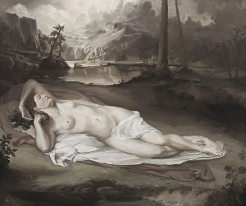 Bush's painting, however, is not quite so earnest; hints of the absurd haunt this image. The Nature of a Bar Painting presents a voluptuous, nude woman, reclining lasciviously in the foreground of some incongruous remote setting. The landscape is ruggedly Australian, and two small figures in the background watch the naked woman furtively while chopping down a tree. Perhaps they are wondering who this woman is, and why she is lounging here, of all places, in the middle of the wilderness. Unlike Lefebvre's Chloe, or Courbet's Woman with a Parrot, there is something staged and a little ridiculous about the composition of our work.