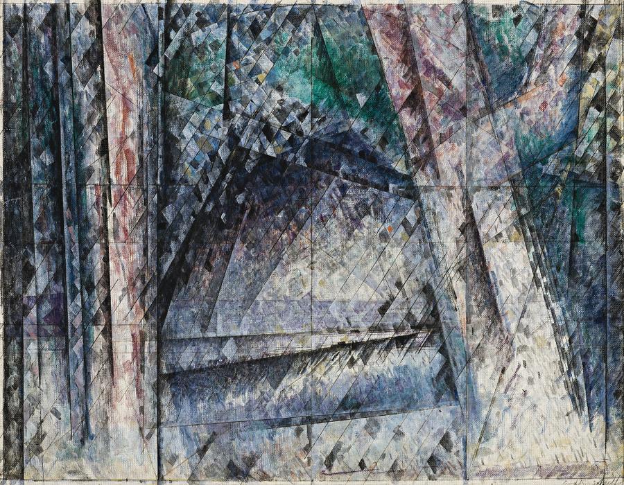 Trees and Mountain, Moonlight, c1957-621 is a classic painting concentrating on two of his favoured motifs -trees and mountains. Its monumental presence is achieved through the harmonious balance of verticals and horizontals. The bulk of the mountain is offset by the weight of the framing tree trunks, with angles answering each other. Colour, reduced to modulations of tone, creates the moonlight effect in sight and mood, moving in its silence. Faceted, as in a mosaic, each segment seems to reflect its own light as well as that of the moon. An overall flickering effect is commanded by stillness, as if time has ceased. Equally miraculous, the mountain and trees seem weightless, floating images, as insubstantial and intransient as all things. As ever, Miller is a master of the paradox, providing the viewer with the path on which to tread.
