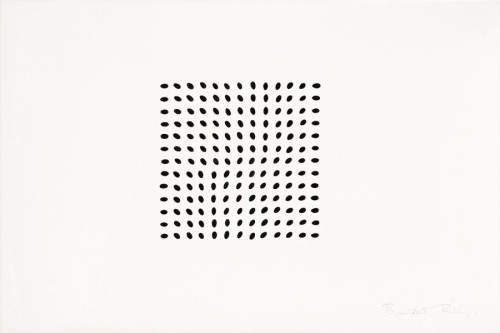 Featuring black elliptical dots on white ground, arranged in a grid but turning fractionally to create a disconcerting, almost irritating, instability of focus, Untitled No. II, 1966 highlights brilliantly this principle of repose, disturbance and repose - so central to Riley's art from this period. By disrupting the regular progression of dots in this way, she thus heightens the emotional resonance of her work to create intense physical and psychological responses within the viewer - effects not dissimilar to those precipitated by contemporary 'happenings'.2 In her fascination with the concept of' disturbance' and specifically, the way in which an internal pattern could be manipulated to work against its larger structure, Untitled No. II also betrays the influence of Pisan Romanesque architecture which Riley had appreciated firsthand during her travels to Italy in 1960 with friend and mentor, Maurice de Sausmarez. Indeed, like the distinctive medieval buildings where the complicated inlays and bands of black and white marble conspire to deny the overall shape of a facade , so too here Riley proffers a sense of disturbed equilibrium within what seems a rigid serial structure - the essential 'subject' of her art from this period.