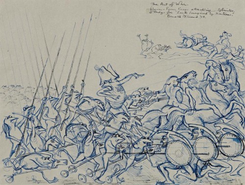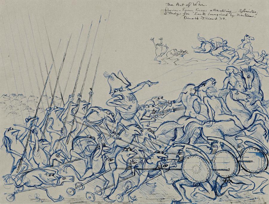 signed, dated and inscribed upper right: The Art of War. / Flower Power Frogs attacking Sybarites. / Study for “Earth Imagined by Martians”. / Donald Friend '78.