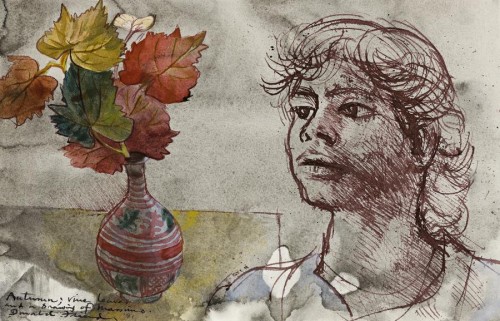 signed, dated and inscribed lower left: Autumn; Vine leaves / and a drawing of Massino. / Donald Friend '81.