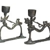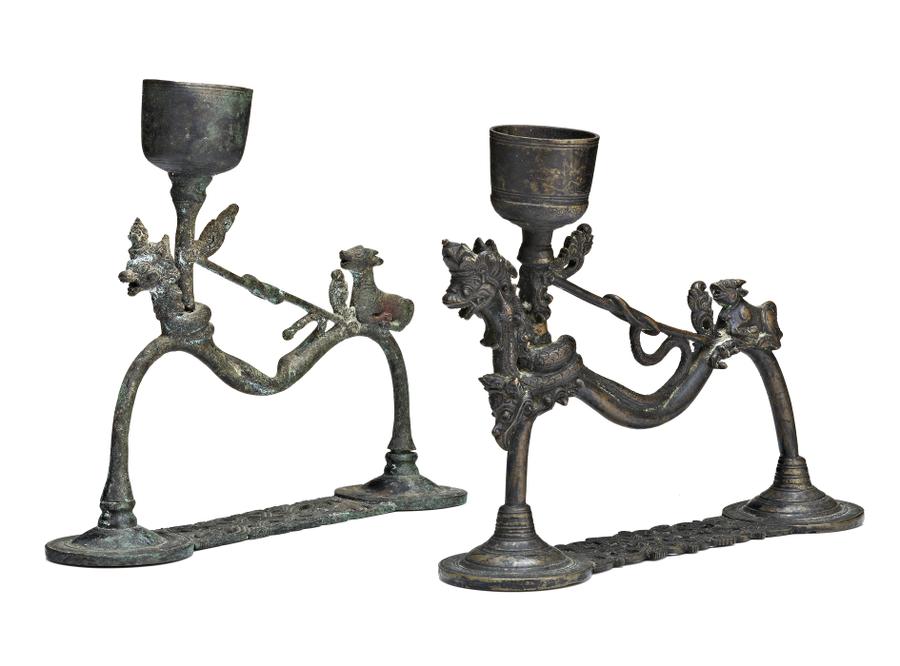 bronze, each with a cup-shaped container for oil rising from a curved supporting frame ending in two legs attached to a flat decorative base. The front of each is adorned with the crowned head of a serpent (naga) whose body forms the curve of the frame. Resting on the back curve of the frame is a bull representing Nandi (the god Siwa's animal vehicle).These lamps are used in the rituals of brahman high priests