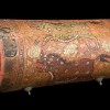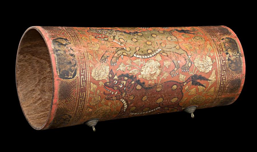 drum cylinder of nangka (jackfruit) wood, hollowed and decorated with four spotted mythological beasts on flower-sprinkled ground with Chinese style fret borders, painted with deep red, brown, green, black and vermillion paint and gilt highlights, with two metal suspension hooks