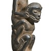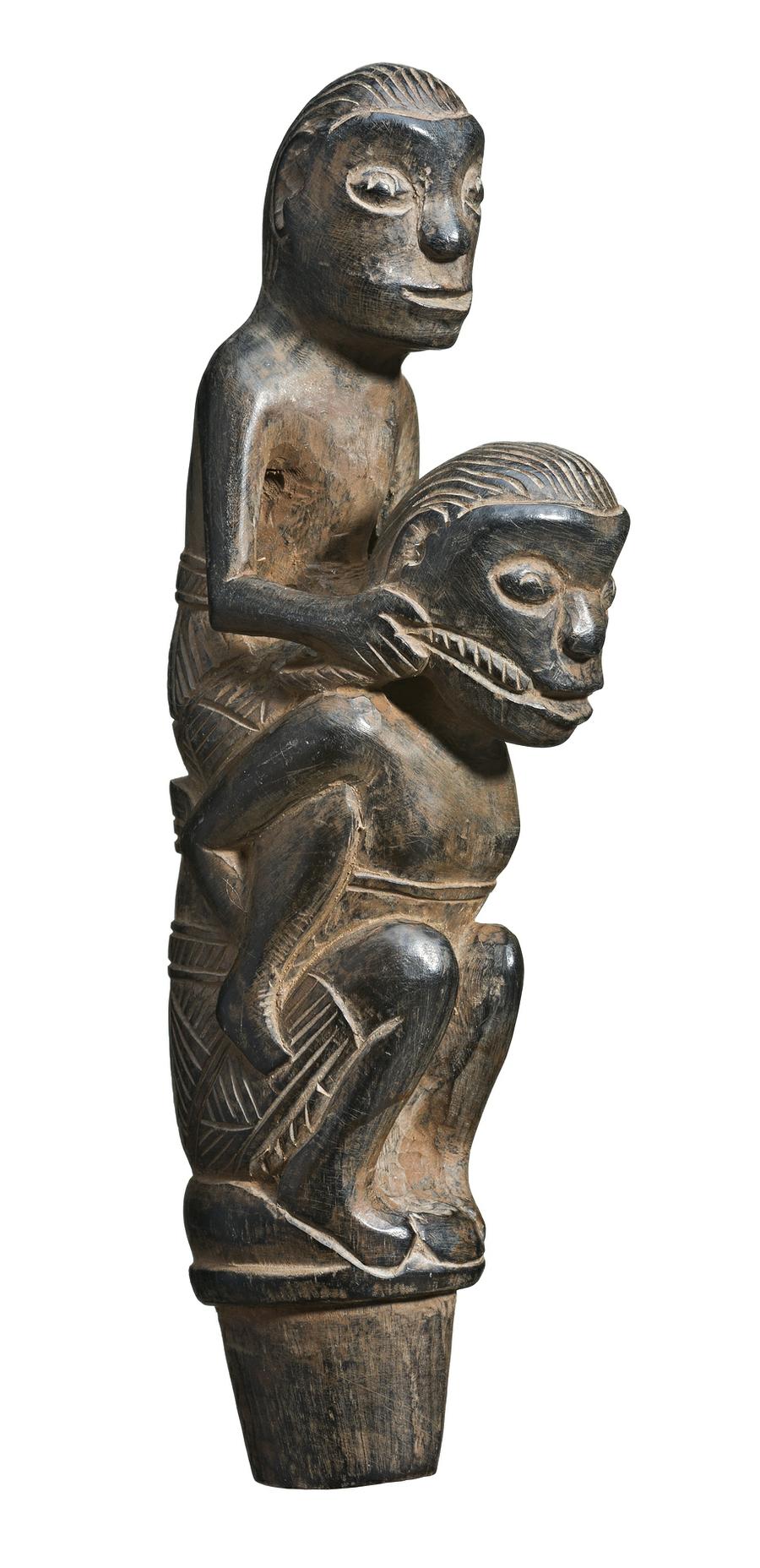 buffalo horn modelled in the form of a male figure riding on the back of a male figure with reins